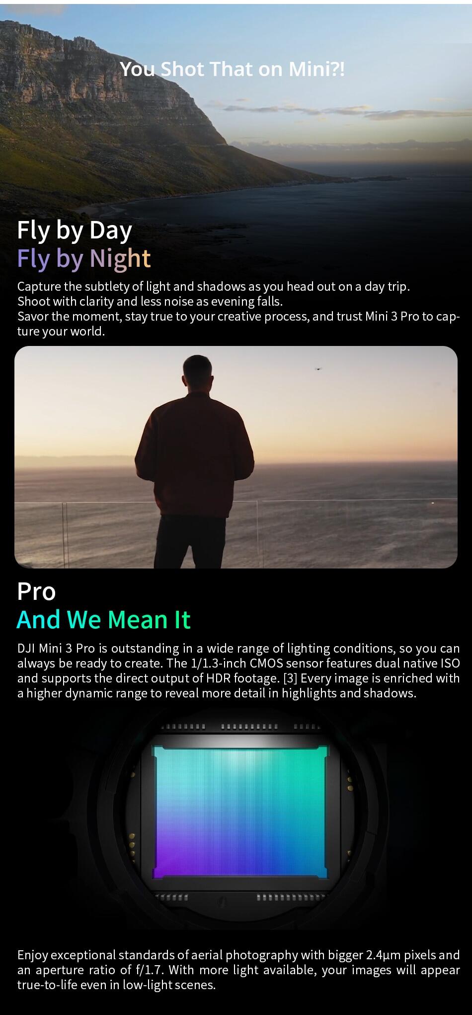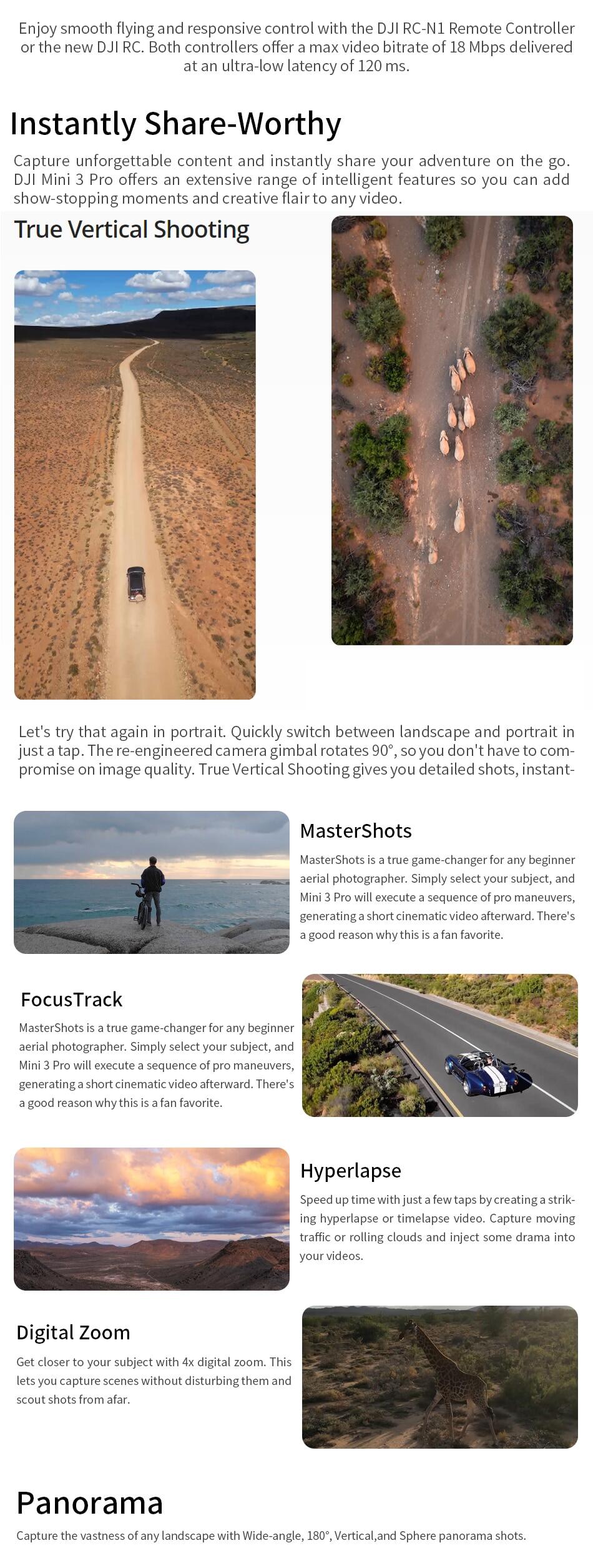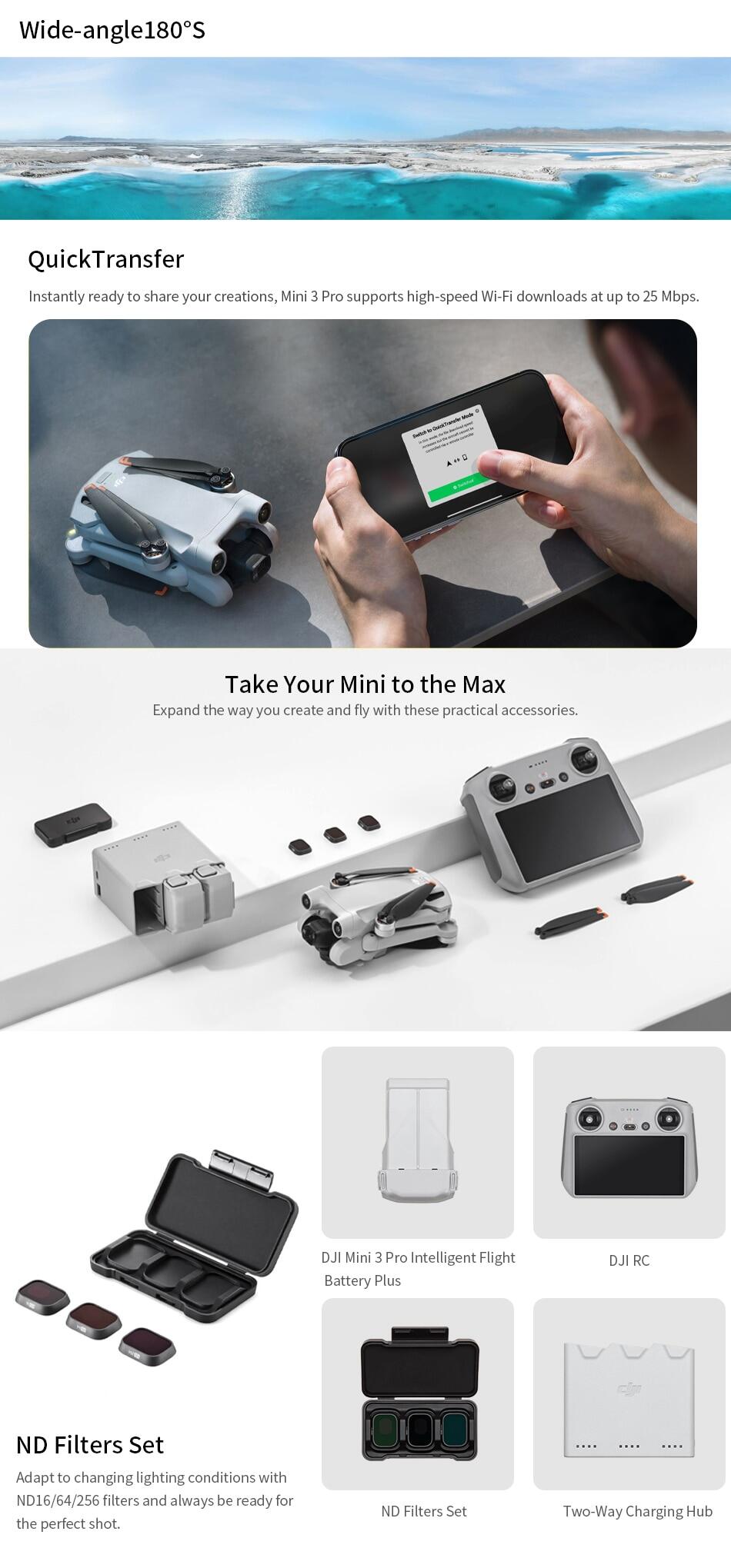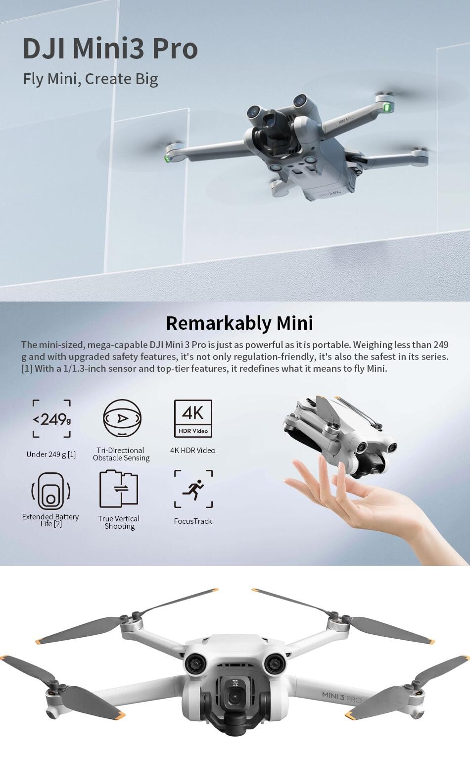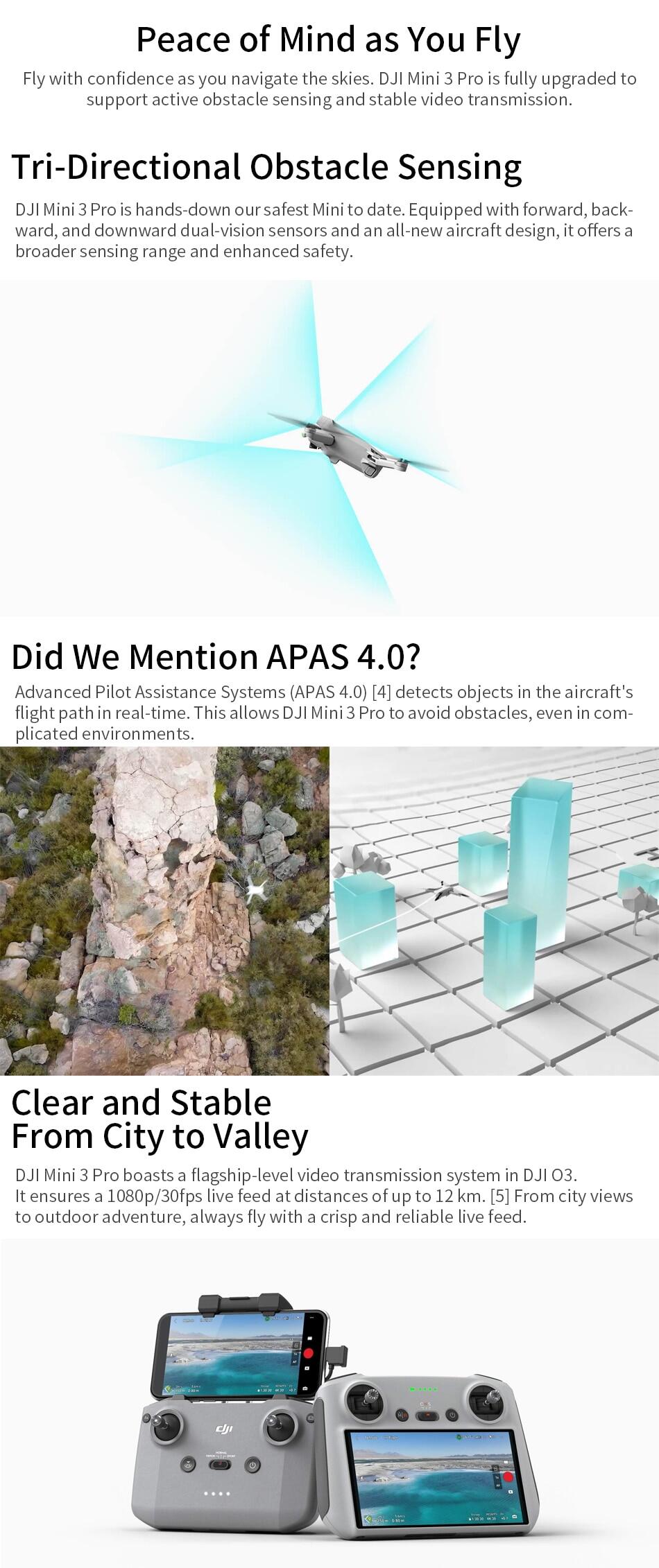 Specifically: Inheriting the 249 g light and compact body, DJI Mini 3 Pro comes with a 1/1.3-inch image sensor that supports native HDR. It supports three-directional obstacle sensing and the newly upgraded APAS 4.0 ( Pilot Assistance Systems). It supports DJI O3 FHD digital video transmission, ensuring a stable live feed at distances of up to 12 km. DJI Mini 3 Pro also supports intelligent features like FocusTrack, True Vertical , Timelapse, MasterShots, and High-Speed QuickTransfer.
