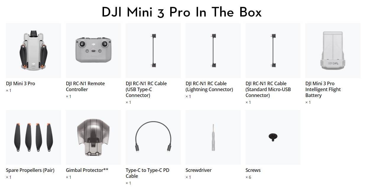 DJI Mini 3 Pro is compatible with DJI 18W USB Charger and DJI RC-N1 and its related accessories (DJI RC-N1 RC Cable, DJI RC-N1 Remote Controller Monitor Hood, DJI RC-N1 Remote Controller Tablet Holder, and DJI RC-N1 Control Sticks). Other DJI Mini 2 accessories are not compatible with DJI Mini 3 Pro.