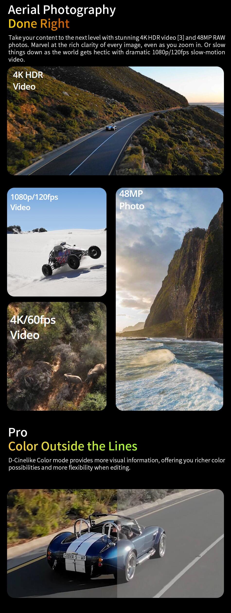 3. True Vertical and expanded axes: The new design allows users to get portrait shots without the need for digital cropping. Fewer gimbal limits mean more angles and added creative freedom. During high-speed flight, the aircraft angle also has less restrictions on the gimbal and the angle.